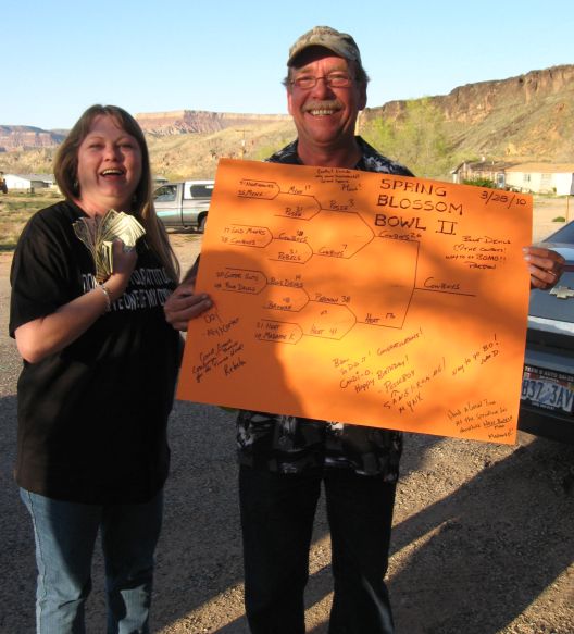 (Hurricane, Utah)_Rolling like a freight train out of control and playing a most excellent doomsday defense, Beau Fisher's Cowboys rocked and shocked the Spring Blossom Bowl, held at Carter Spendlove's sunny and warm home in Hurricane on Sunday March 28th. Beau's powerful Cowboys rode over Jim's Gold Miners 38-17 in the opening round, then heaved a 70 yard last play touchdown pass to oust Gary's Rebels 37-31 in the quarter-finals. Continuing to roll, the Cowboys shut down Mike's powerful Posse 7-3 in the semi-finals to ride into the championship game against Tim's hometown Heat. In the title tilt the Cowboys roared out to a 17-0 second quarter lead. Then his dynamite defense held off the Heat 26-13 to win his second ZFL crown - and his first since October 2006 when he beat Tim's Heat to win Harvest Bowl IV at Spendlove Place. Tim, Ally, and Carter were great hosts providing good food and great times as Hurricane blossomed all around the yard.Spring Blossom Bowl Notes_Tim's Heat trailed pumped up Parowan 38-24 in the middle of the third quarter before rallying to a 41-38 overtime semi-final win…Mike's defending Spring Blossom Bowl champion Posse scored two touchdowns in the last six plays of the game to upset Helen's Mynx 31-17 in quarter-final action… Doug's Parowan crushed the Blue Devils 48-14 in the quarter-finals, handing Preston his first ZFL tourney defeat of the year…Katie's Gutter Sluts made their 2010 ZFL debut and went down swinging in a 44-20 first round loss to the Blue Devils…John's Nighthawks blew a 21-3 first quarter lead, losing 35-31 to Helen's menacin' Mynx in the first round…The Heat begin their march to the title game with a 31-10 win over Madame K...